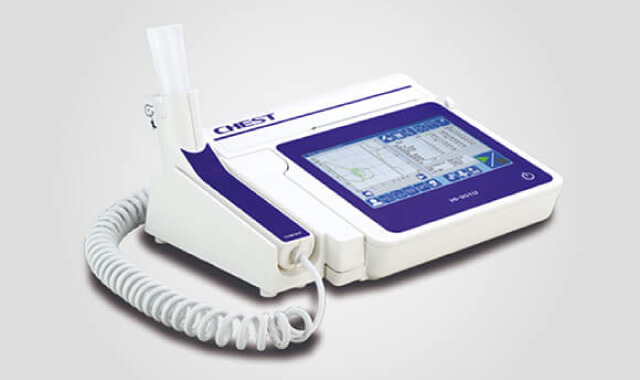 肺機能検査といい、換気のはらたきを測定する機器です。気管支喘息の診断や肺気腫・COPDなどの重症度を調べるのに役立つ重要な検査です。