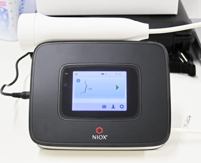 気道の好酸球性(アレルギー)炎症の指標として、広く活用されるようになりました。簡便に測定できるので、当院では2種類の機器を活用して、喘息の補助診断、継時的な気管支の炎症(アレルギーによるただれ具合)をモニターしております。