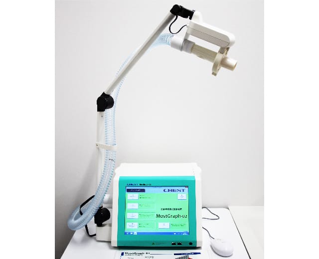 安静呼吸にて呼吸抵抗が短時間で測定でき、スパイロメータ実施困難な小児や呼吸困難な方にでも負担なく実施することが可能です。3Dカラーグラフィック表示され、スパイロメータでは検出できない気道の広がりや痰の絡み、肺の硬さなど評価できるようになりました。