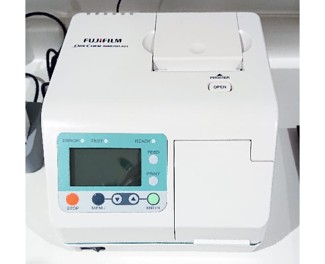 ウイルスや細菌検出の高感度化を実現した、新発想の感染症のプラットフォームです。従来法の免疫クロマト法による迅速検査キットと比べ、インフルエンザウイルスのより発症早期の診断が可能となりましたので、発症初期などに適宜実施しています。また、他の呼吸器感染症であるマイコプラズマ、溶連菌などもおおよそ15分程度で結果判定が可能となりました。