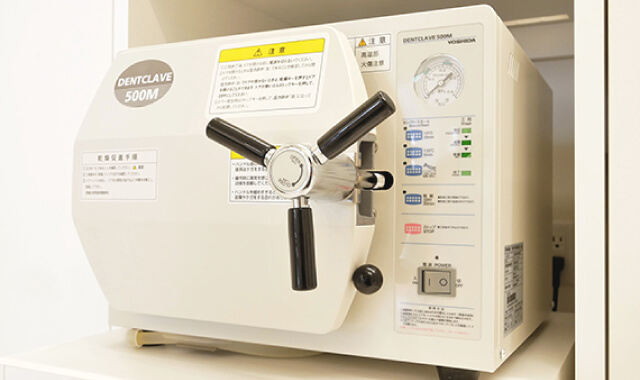 治療に用いる器具はこの滅菌器で滅菌した清潔なものを使い、患者さまごと・使用ごとに交換し、院内感染を防止します。気圧と温度を調節して121℃まで上げ、20分程度の短時間で確実に細菌・微生物・胞子を全て滅菌します。