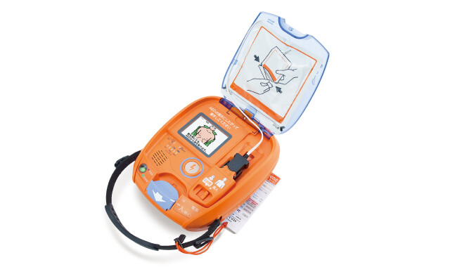 心室細動や無脈性心室頻拍といった致死的な不整脈が発生した場合に、電気ショックを与えて心臓を正常なリズムに戻すための医療機器です。一般の方や医療従事者が迅速に使用できるように設計されています。