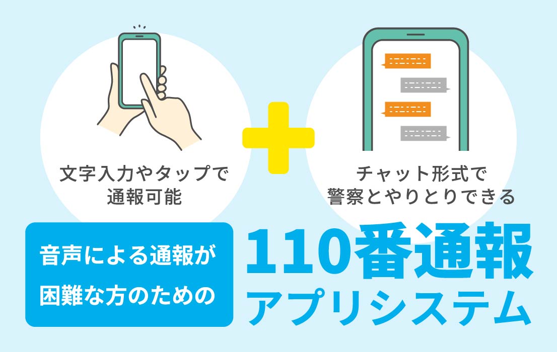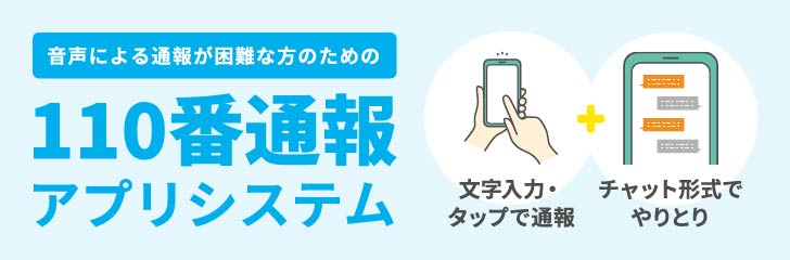 広島県警察では広島県内の出来事の通報において聴覚や言語に障害のある方など音声による110番通報が困難な方に向けて「110番アプリシステム」を利用したスマートフォン・フィーチャーフォンでのチャットによる通報や、ファックスやメールによる110番通報を受け付けています。