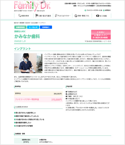 ファミリードクターの有料プランではクリニックの名前・診療科目などの基本情報だけでなく、クリニックの特徴や設備機器、院内写真などさまざまな情報を掲載することができます。