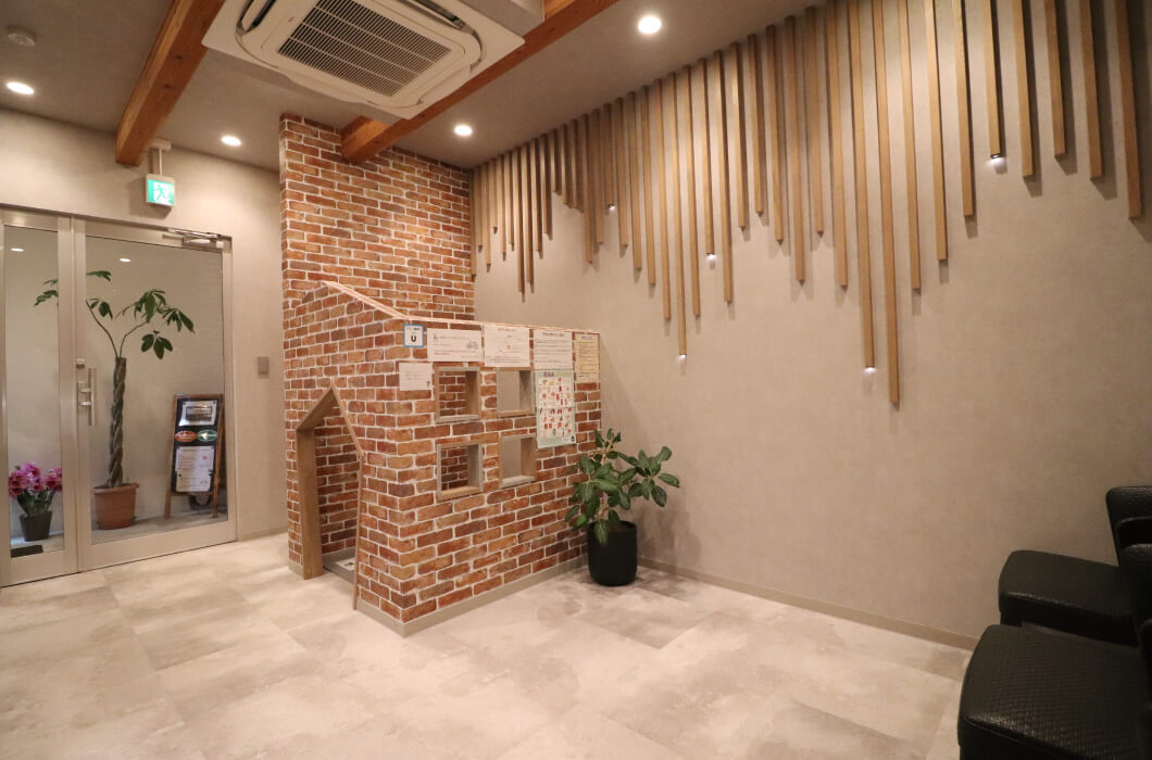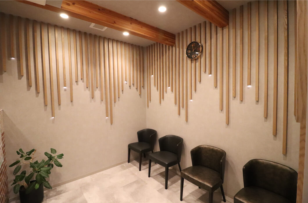 木の梁を活かして、待合スペースの壁も木でデザイン