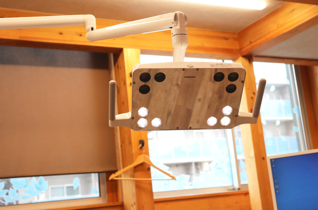 「痛かったら手を挙げてください」と言われても、なかなか手を挙げづらいと思うので、当院ではなるべく患者さんの表情から痛みを読み取れるようにタオルで顔を覆わないようにしています。また今何をされているかわからないと恐怖を感じてしまうので、大きなミラー付きの照明を採用しました。目の前の鏡で今のご自身の歯の状態や、どんな治療が行われているかを確認していただけます。