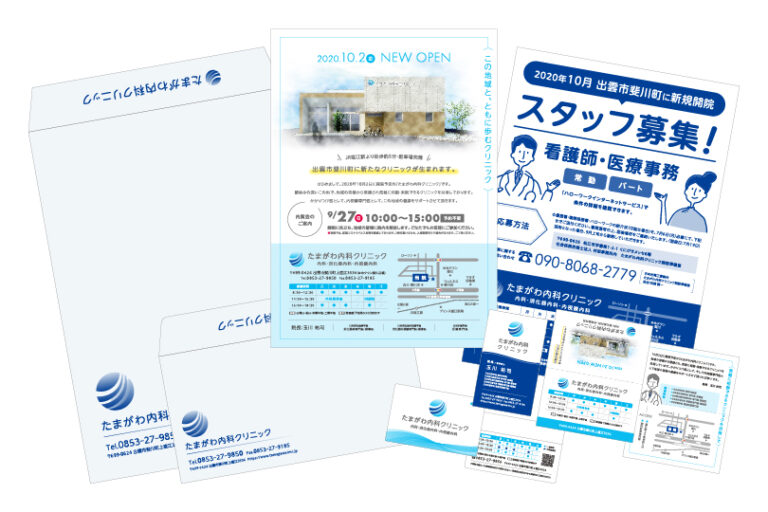 02-印刷物名刺や挨拶状、開院チラシにリーフレットなど各種印刷物 「初めまして」のご挨拶となる挨拶状や名刺、初めてクリニックを知る地域の人に「行ってみたい」「どんなクリニックだろう」と興味を持ってもらえるチラシなど、各種印刷物を作成いたします。