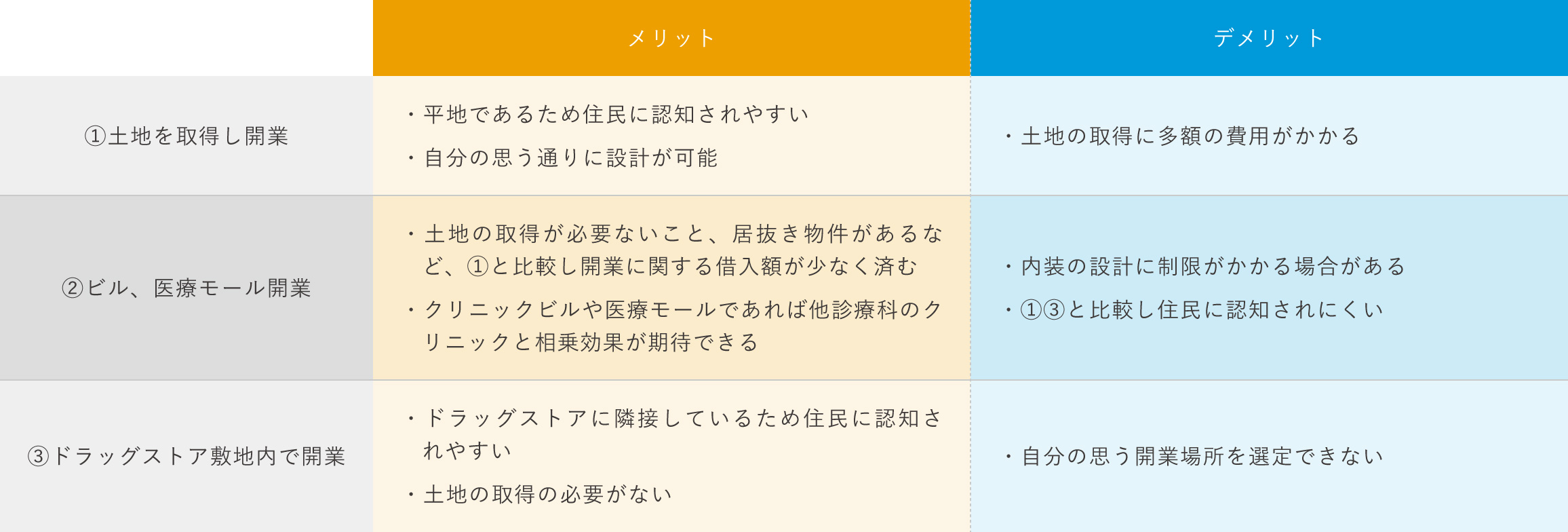 開業場所のパターンは大きく①土地を取得し開業、②ビルやクリニックモール開業、③ドラッグストア敷地内で開業の3つに分かれます。 パターン別にメリット・デメリットをまとめると下記のようになります。