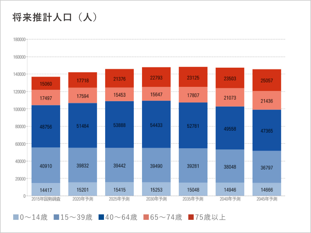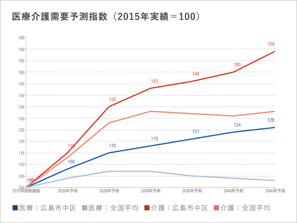 広島市中区は2035年まで人口は増加する予測となっており、以後は緩やかに減少していく予測です。しかし、医療機関を受診する可能性の高い高齢者は2045年まで増加する傾向にあるため、医療需要は増加する事が予測されています。