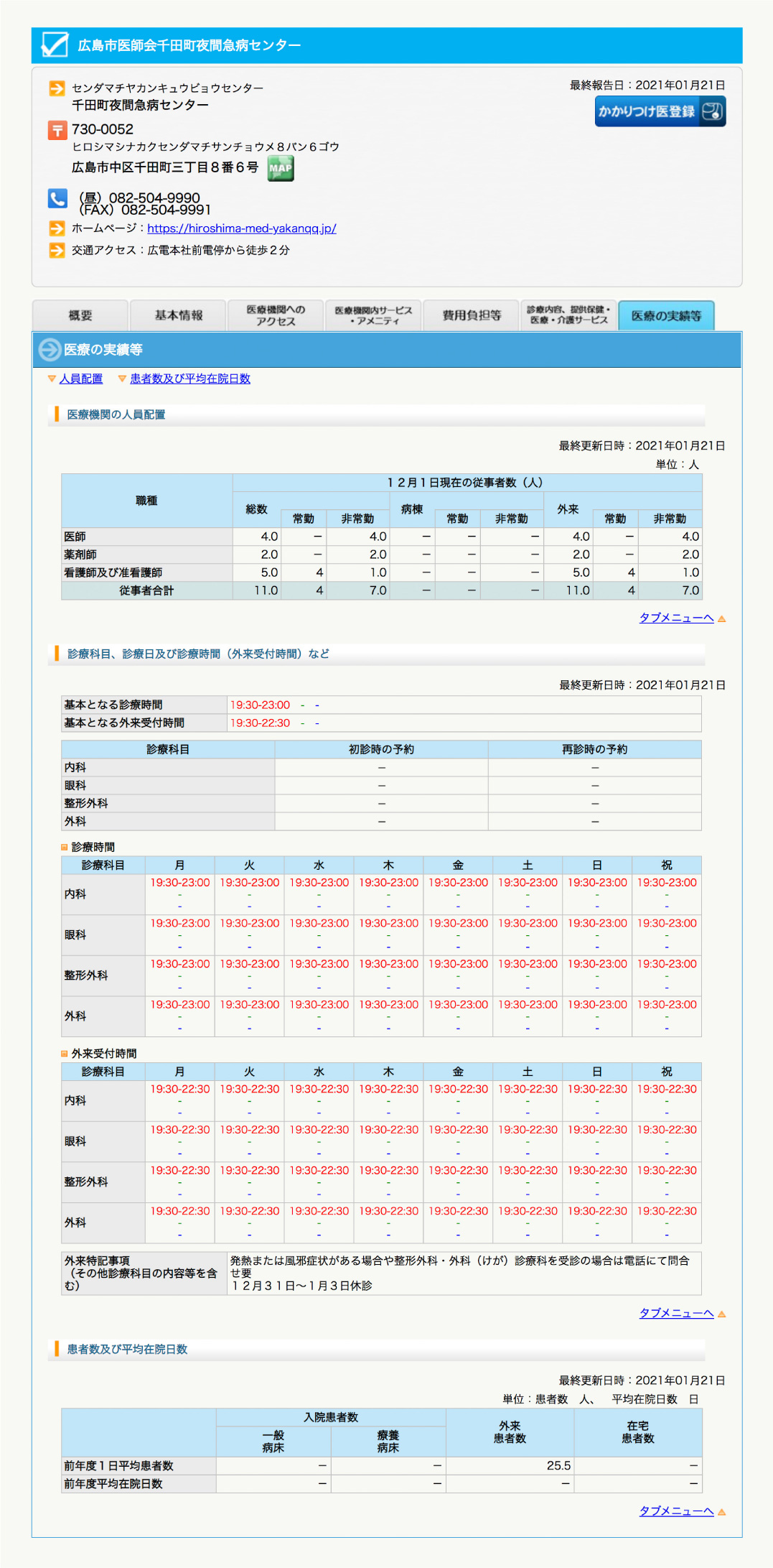 医療機能情報提供制度の情報から、千田町夜間急病センターは非常勤の医師4人配置があり、夜間の診療時間に内科、眼科、整形外科、外科を診療しており、1日患者は約25人という事が分かります。その他に専門医の配置数や消化器系領域であれば内視鏡検査の検査数等や整形外科であればリハビリ実施件数やMRI撮影件数を公表している医療機関もあります。