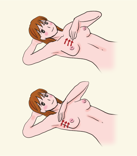 セルフチェックは、閉経前の方は乳房がやわらかくなる月経終了後1週間~10日の間に、閉経後の方は日にちを決めて、毎月1回行うようにしましょう。