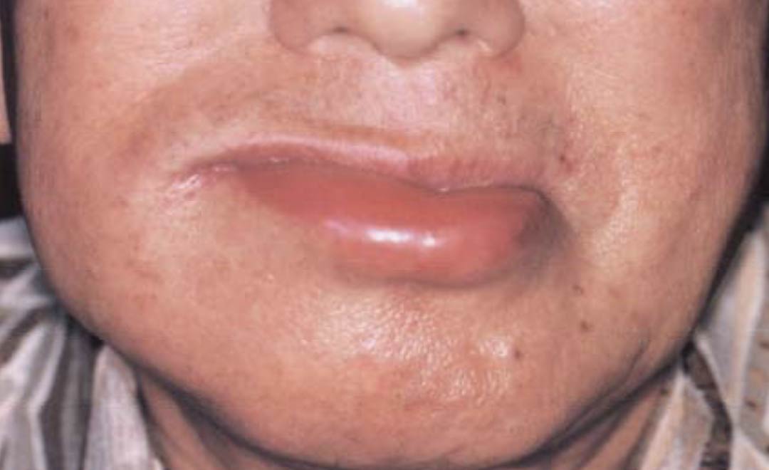 下唇に、紅斑がなく境界がはっきりしない浮腫性の腫れが現れている