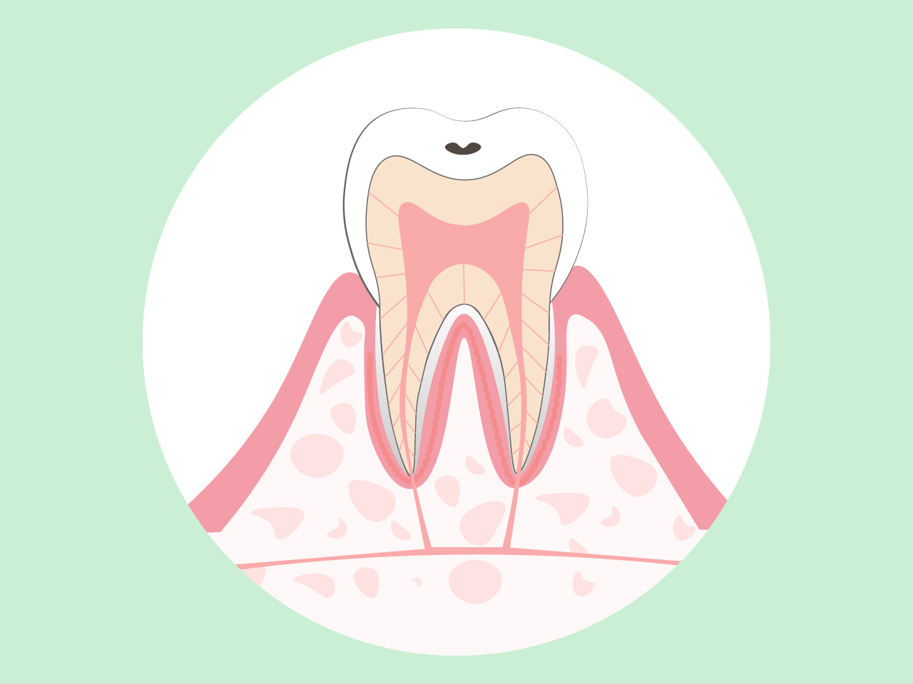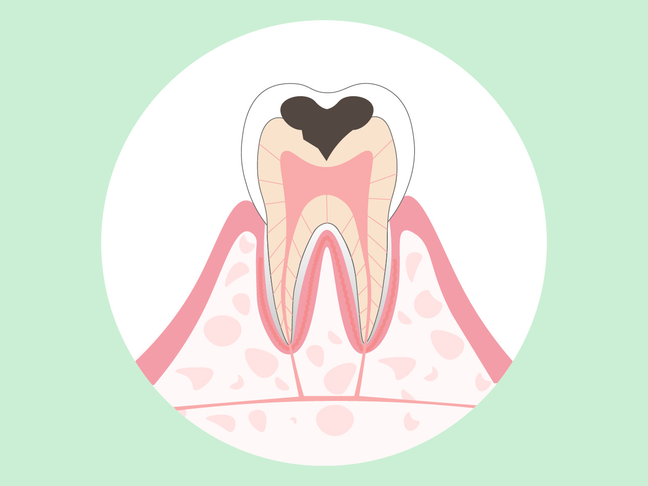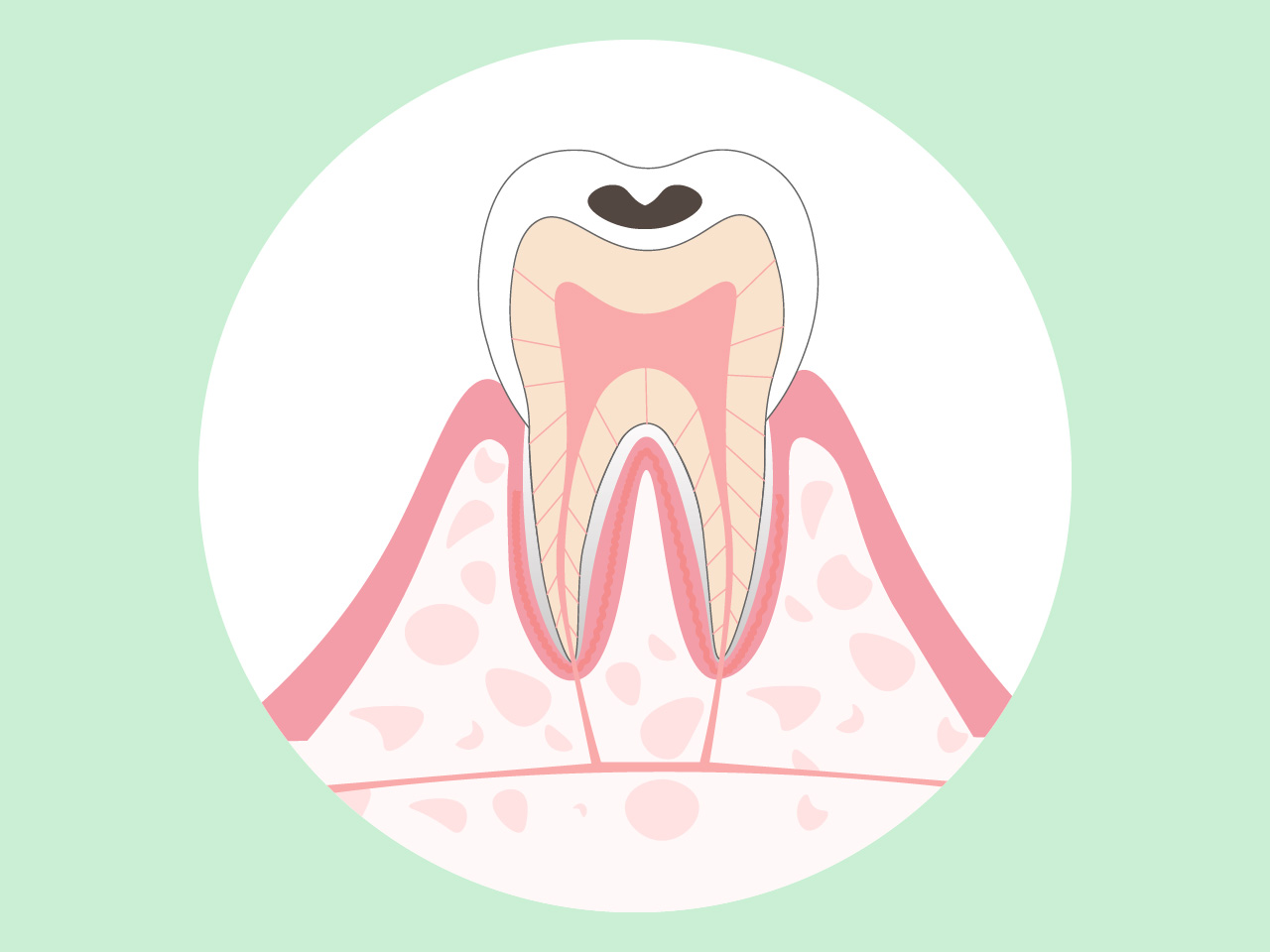 エナメル質の内側にある象牙質まで虫歯が進行した状態です。冷たいものや温かいもの、甘いものがしみるようになり、ときどき痛むこともあります。