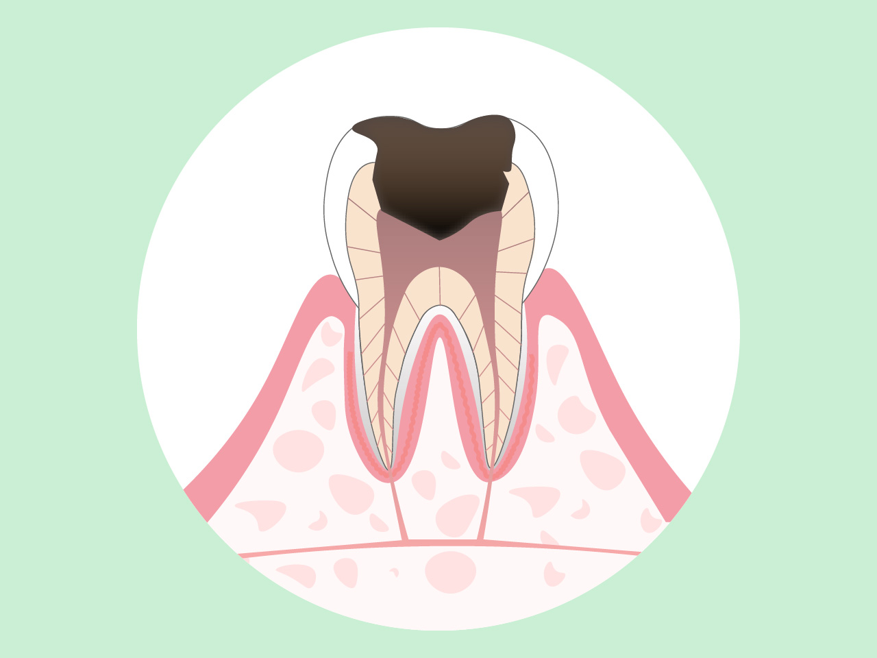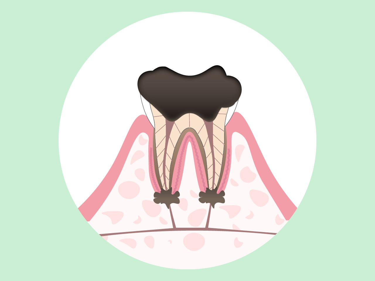 歯の大部分が溶けてなくなり、歯根まで虫歯で溶けた状態です。神経が死に、痛みはなくなりますが、歯根部に膿が溜まると再び痛みが出ます。