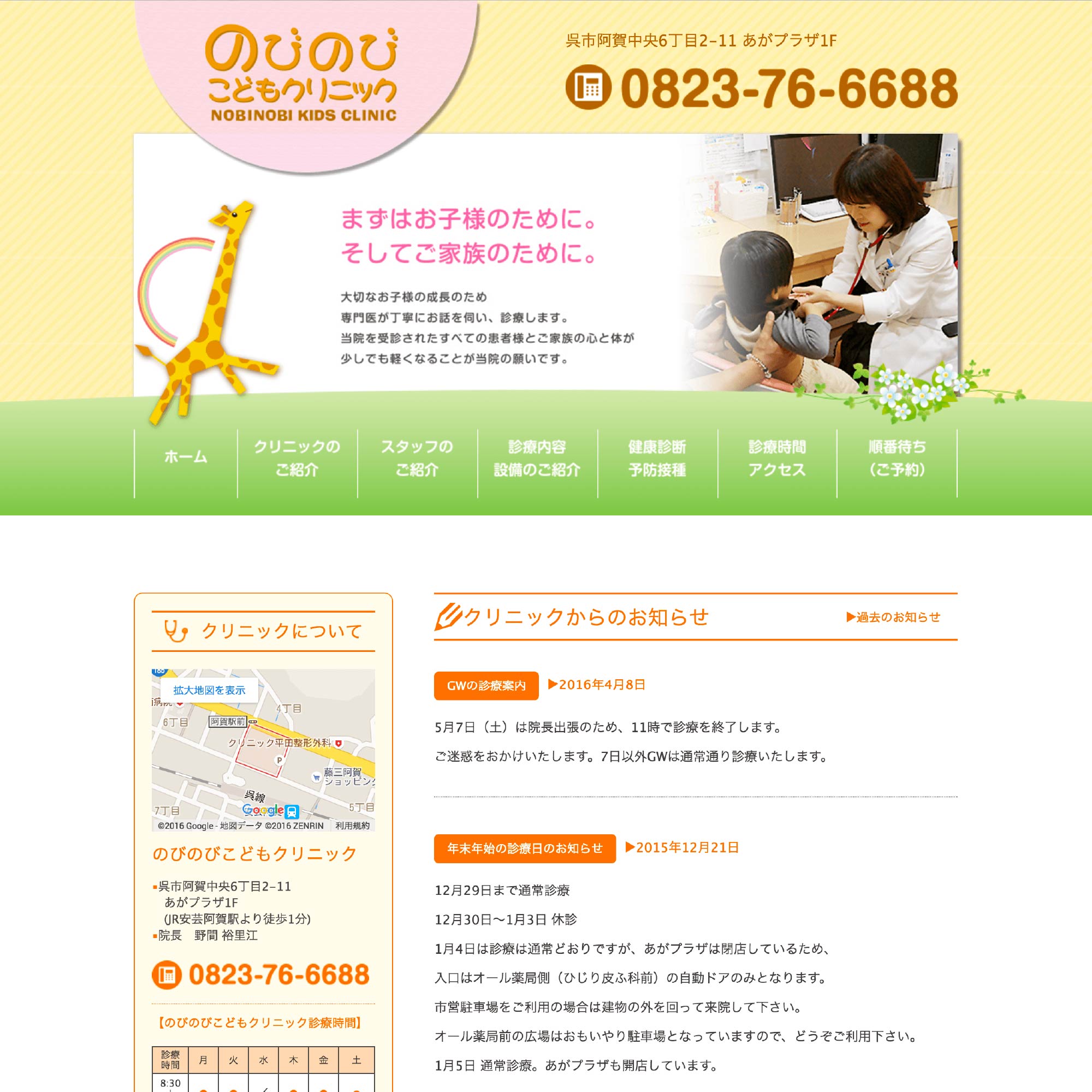 小児疾患・アレルギー・喘息・乳児健診・予防接種のことなら、「のびのびこどもクリニック(広島県呉市阿賀中央)」にお任せください。大切なお子様の成長のため、専門医が丁寧にお話を伺い診療します。