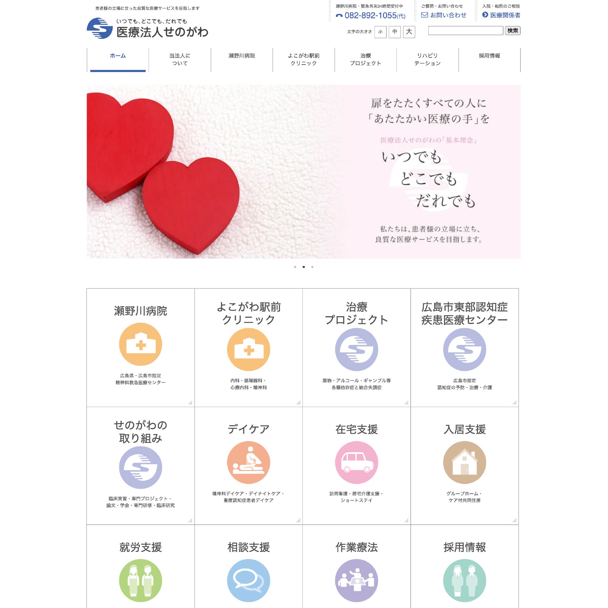医療法人せのがわでは基本理念「いつでも、どこでも、だれでも」を元に、広島県・広島市指定の365日24時間対応の精神科救急医療センター「瀬野川病院」を中核に、薬物依存症・アルコール依存症・統合失調症・うつ病,・認知症などの精神科治療をはじめ、デイケア・在宅支援・入居支援・就労支援・相談支援を通じて、患者様の立場に立った良質の医療サービスを目指します。