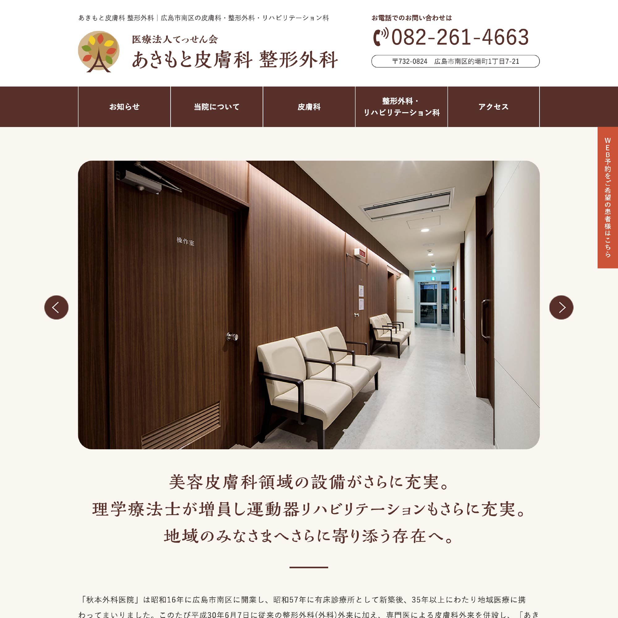 「秋本外科医院」は昭和16年に広島市南区に開業し、昭和57年に有床診療所として新築後、35年以上にわたり地域医療に携わってまいりました。このたび平成30年6月7日に従来の整形外科(外科)外来に加え、専門医による皮膚科外来を併設し、「あきもと皮膚科 整形外科」としてリニューアル開院いたしました。的場町電停より徒歩約1分・広島駅より徒歩約9分のアクセスの良さはそのままに、「皮膚科」「整形外科」の双方から、今まで以上に地域のみなさまに寄り添っていけるよう努力してまいります。生まれ変わりました「あきもと皮膚科 整形外科」を今後ともよろしくお願いいたします。