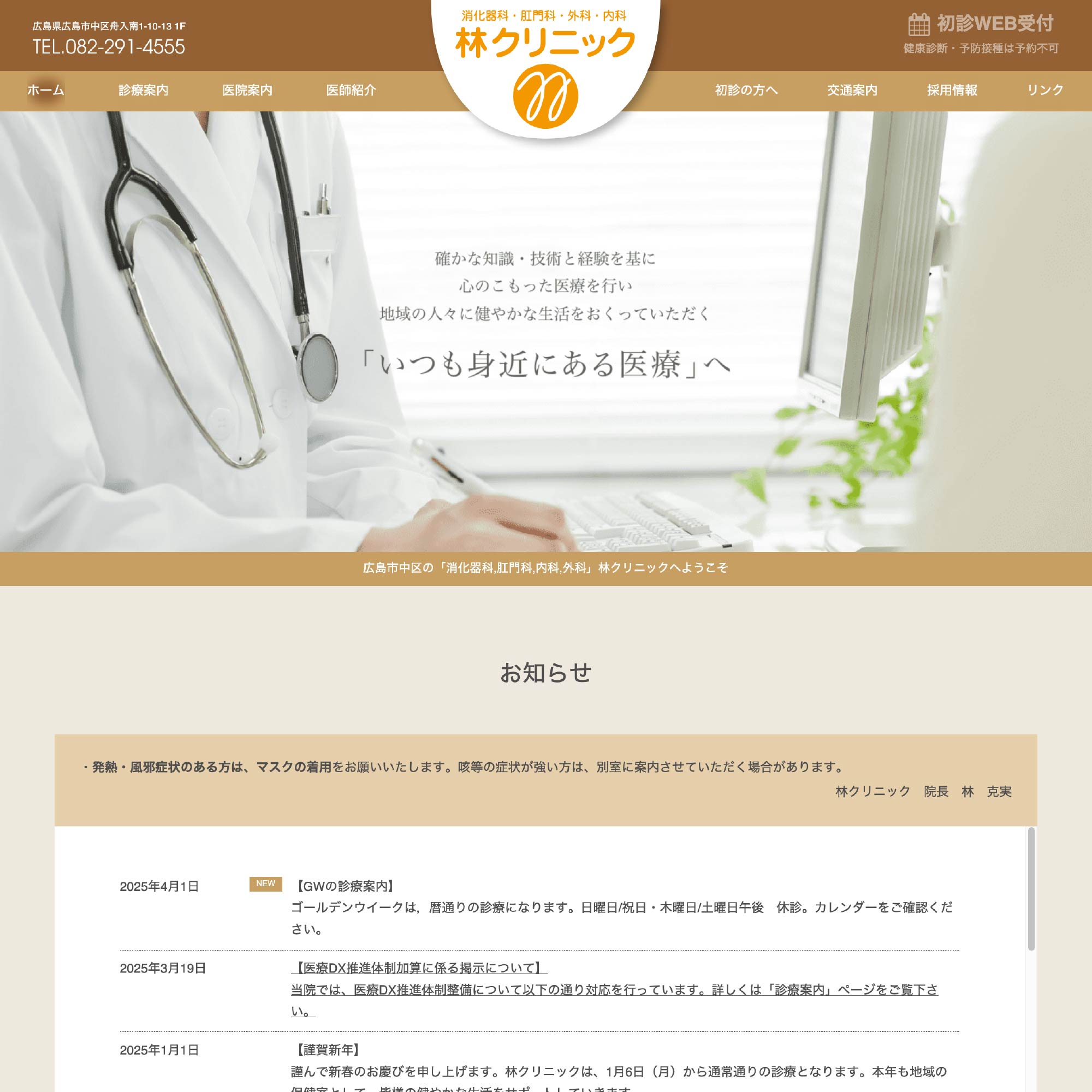 林クリニックは広島市中区舟入南にある消化器・肛門科・外科・内科クリニックです。1970年から続く開業医で、消化器・肛門科をはじめ、外傷・熱傷等の外科、一般内科を中心に皆様のかかりつけ医・家庭医として診療を行っています。私たちは患者さんと同じ目線でいることを心がけ、何でも相談してもらえる家庭医である事を目指します。専門的知識と経験をふまえ、患者さん一人ひとりの悩み、疾患に向き合います。