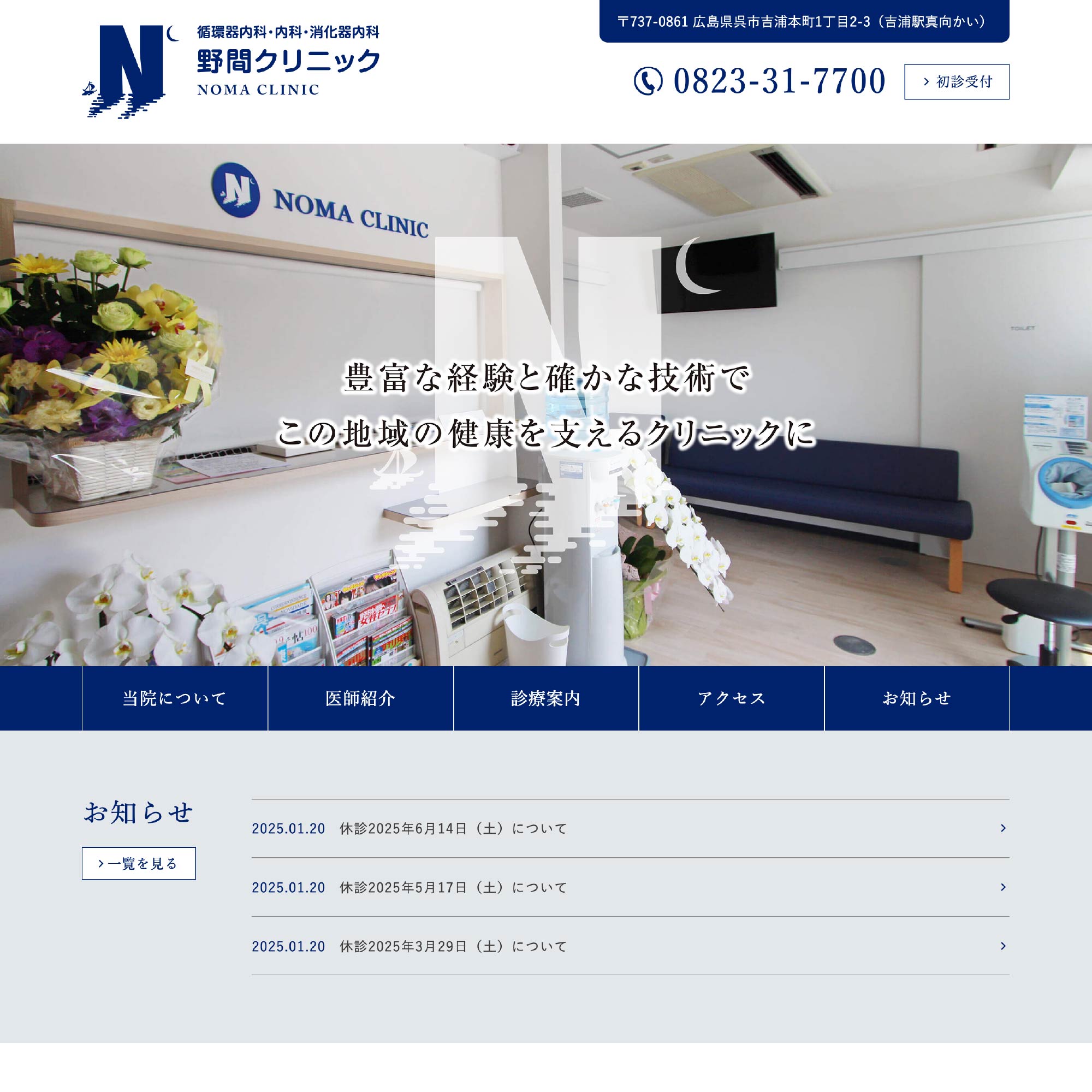 呉市吉浦本町の野間クリニックは「抗加齢医学」の専門クリニックでもあり、元気でいる時間を少しでも伸ばす「健康寿命の延伸化」を目標に掲げています。血管年齢の測定や骨密度検査、老化を促進する高血圧症、脂質異常症、糖尿病、高尿酸血症といった生活習慣病に対する検査と加療をはじめ、心臓病、脳血管疾患、慢性腎臓病、消化器疾患、一般内科疾患、内分泌性疾患、頻尿、認知症など、老化に関連する多くの病気の検査と加療、およびご相談を受けたまわっております。当院の設備ではできない精密検査も、連携医療機関と密に連携しておりますので、迅速な対応が可能です。誠実、丁寧に、そして柔らかく当院スタッフが対応しておりますので、お気軽な気持ちでご相談ください。是非、皆様の元気な時間を伸ばすことをお手伝いさせてください。