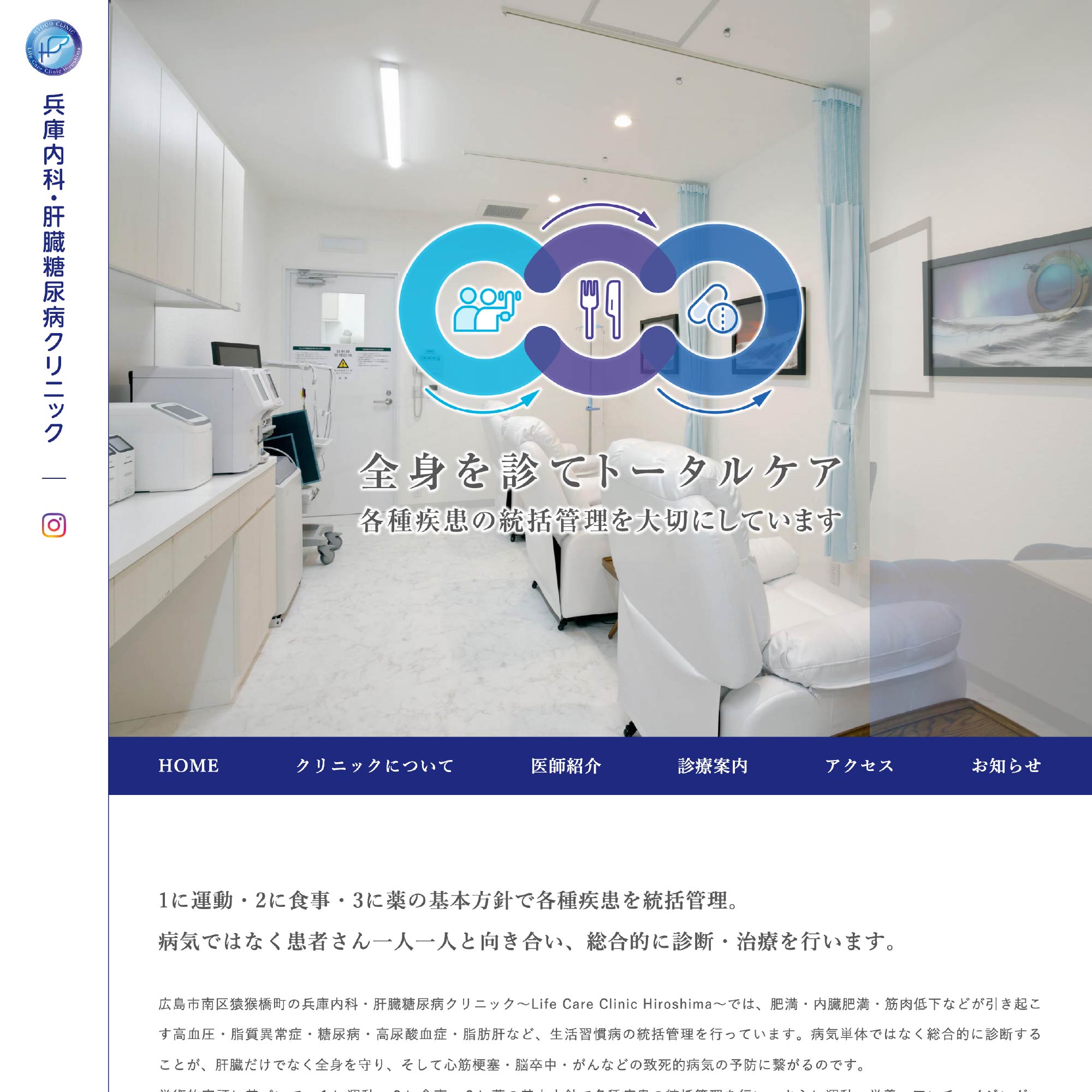 広島駅より徒歩5分の兵庫内科・肝臓糖尿病クリニック~Life Care Clinic Hiroshima~(広島市南区猿猴橋町)では、肥満・内臓肥満・筋肉低下などが引き起こす高血圧・脂質異常症・糖尿病・高尿酸血症・脂肪肝など、生活習慣病の統括管理を行っています。1に運動・2に食事・3に薬の基本方針で、病気ではなく患者さん一人一人と向き合い、総合的に診断・治療を行います。