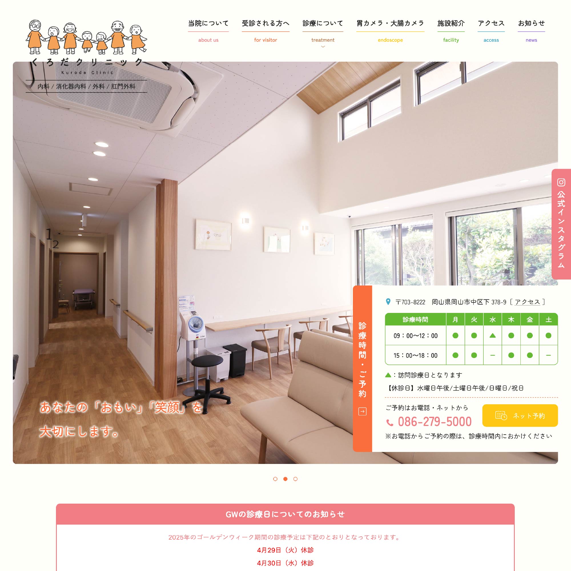 岡山市中区の内科・消化器内科・外科・肛門外科「くろだクリニック」では、かぜ、高血圧や糖尿病といった生活習慣病から、切り傷などの外科処置、肛門疾患まで幅広く診察いたします。また、予防接種や健康診断もお受けいただけます。