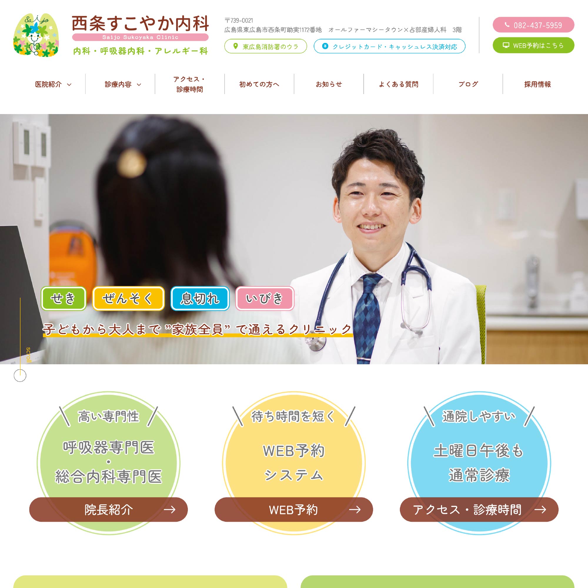 東広島市西条町助実(ゆめモール西条内)の内科・呼吸器内科・アレルギー科のクリニック。CT完備。長引く咳や喘息、高血圧、糖尿病でお悩みの方はご相談下さい。肺がんCT検診・睡眠時無呼吸外来・禁煙外来あり。土曜午後・木曜午後も通常診療。駐車場完備。