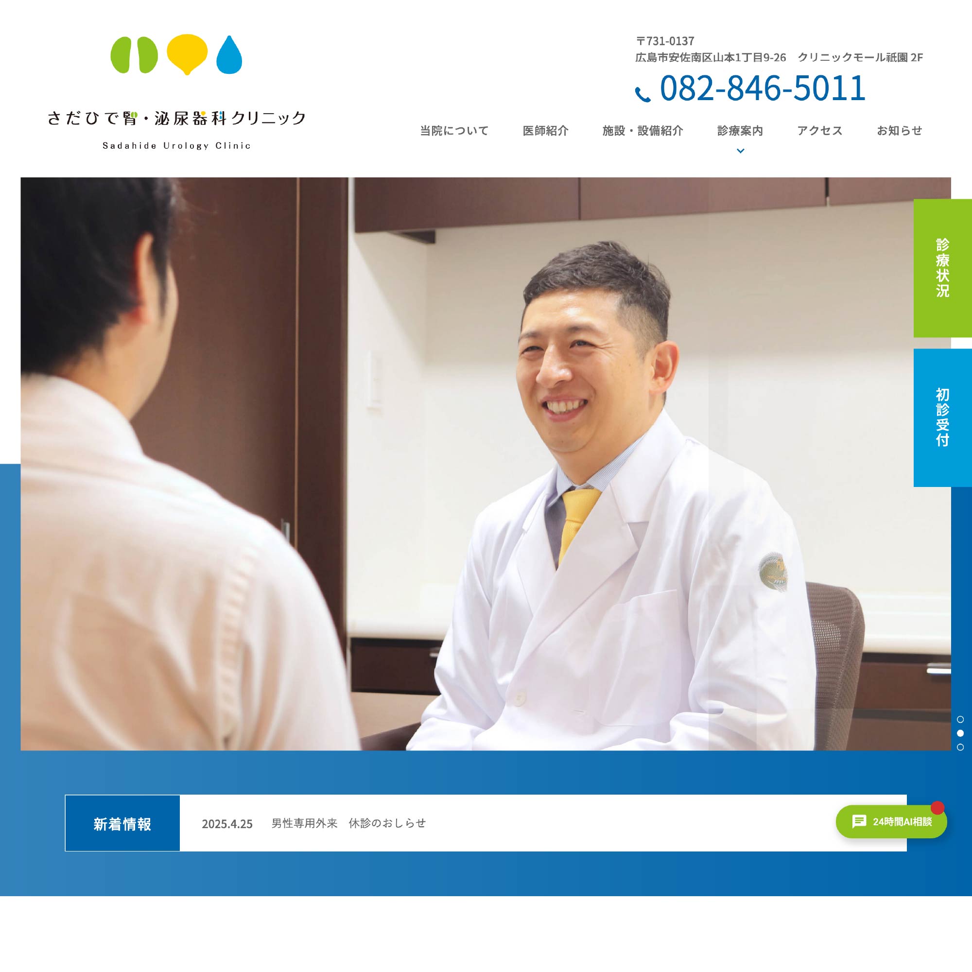 さだひで腎・泌尿器科クリニックでは、男性・女性・お子様それぞれの泌尿器のお悩みについて、専門知識を活かした適切な治療をご提供いたします。また、腎臓外科では腎臓がん、腎盂・尿管がん、腎盂腎炎、腎・尿管結石など腎臓や周辺器官に関する診療を行います。